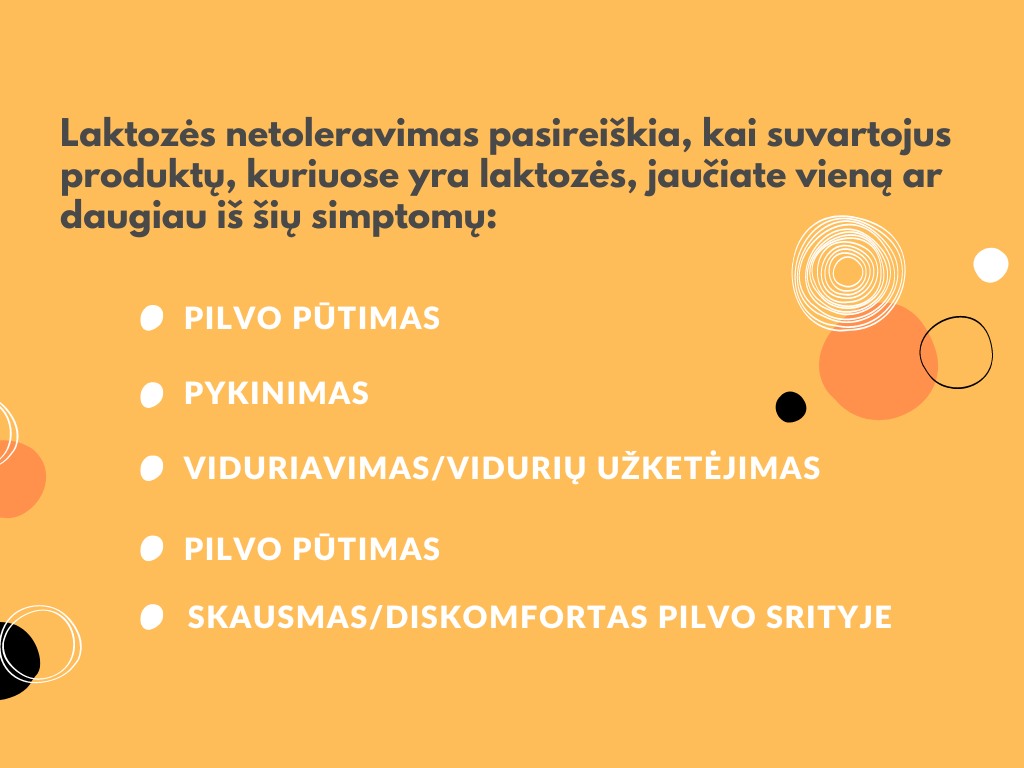 Simptomai atsiranda, kai plonoji žarna nepagamina pakankamai fermento laktazės, kurio reikia, jog laktozė būtų suvirškinta, todėl laktozė lieka virškinimo sistemoje. Dėl to susidaro įvairios dujos, kurios sukelia simptomus, susijusius su laktozės netoleravimu.